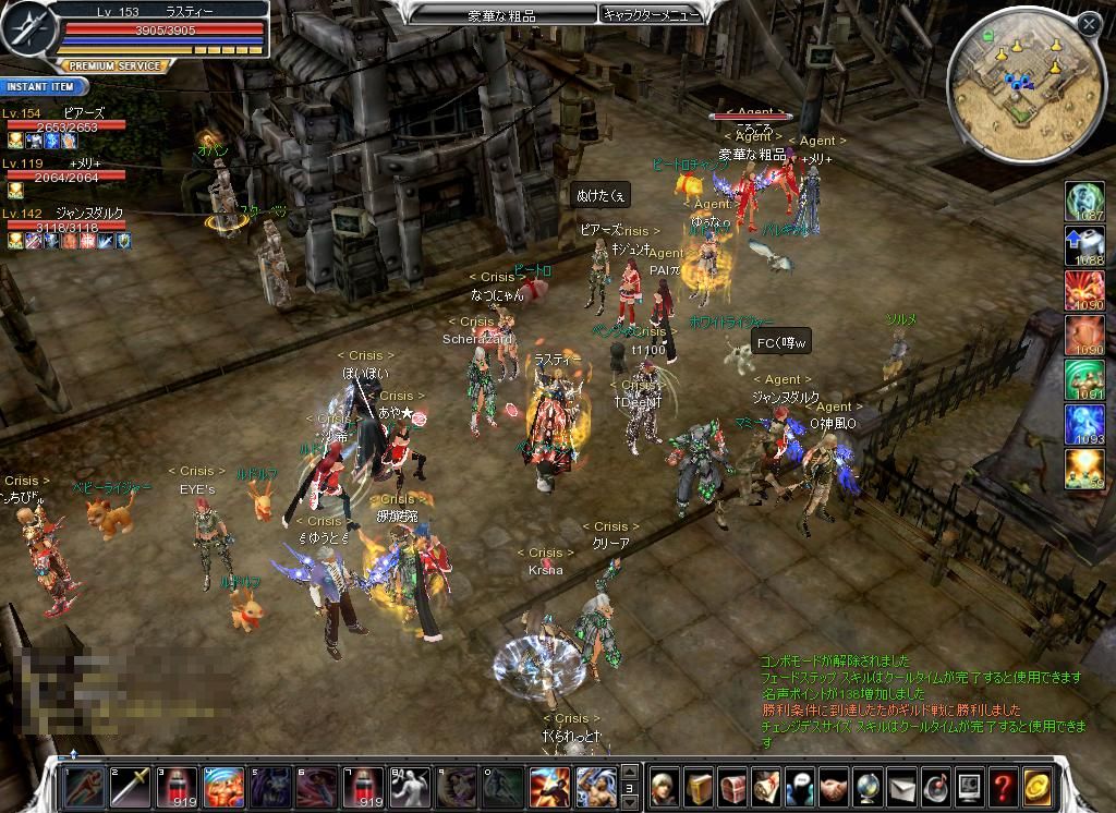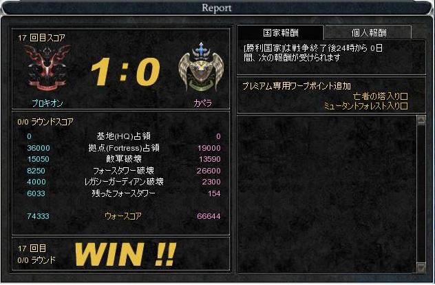 その前に カバルINできません! 「バージョンの呼び出しに失敗しました。」 ←公式に飛びます 原因はどうやらIEのセキュリィに問題があるとか メッセでギルメン呼び出しなんとか解決していざ戦争へ!! 待機だしウワァァ━━━━。゚(゚´Д`゚)゚。━━━━ン!!! またはじめ参戦できませんでした。・゚・(*ノД`*)・゚・。 待機が思いのほか長くて(カペラ萎えてきたのかな? INしただばC2に押し込まれてる状態。 やべーやべーと言いながらもポイントでは勝ってる!? FT破壊でかなり稼ぎましたね! 逆にカペラはあまり破壊に来なかったイメージが、今日はこっちの復活も少なかったけど破壊しに来る余裕はあったと思うんだけどな? いっぽうこっちはかなりの人数が破壊工作にいっていて途中何人かあって一緒に叩いてました。 しかしNラインもカペラも結構いましたね・・ インフィニティ切れたらぼこされるのみです 防衛スキルがないWIZさんよくやるなぁと思います。 途中C2までやばかったのに最後はNラインまで前線も上がってきましたね! つよいプロキの時代がもどってきたかも!? |